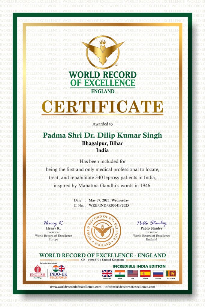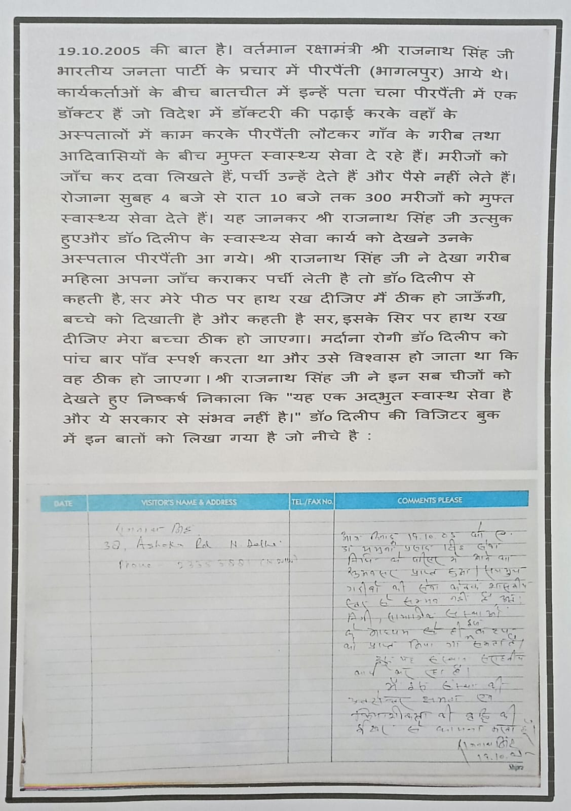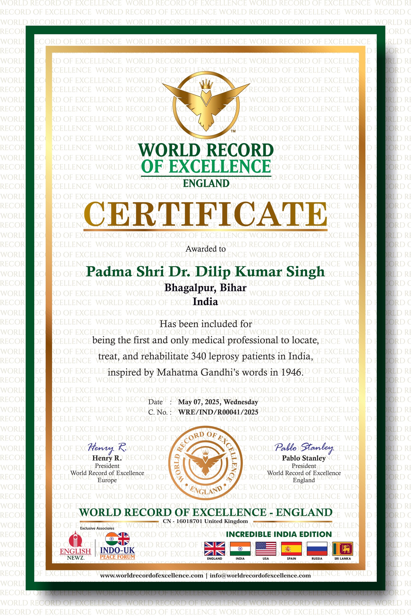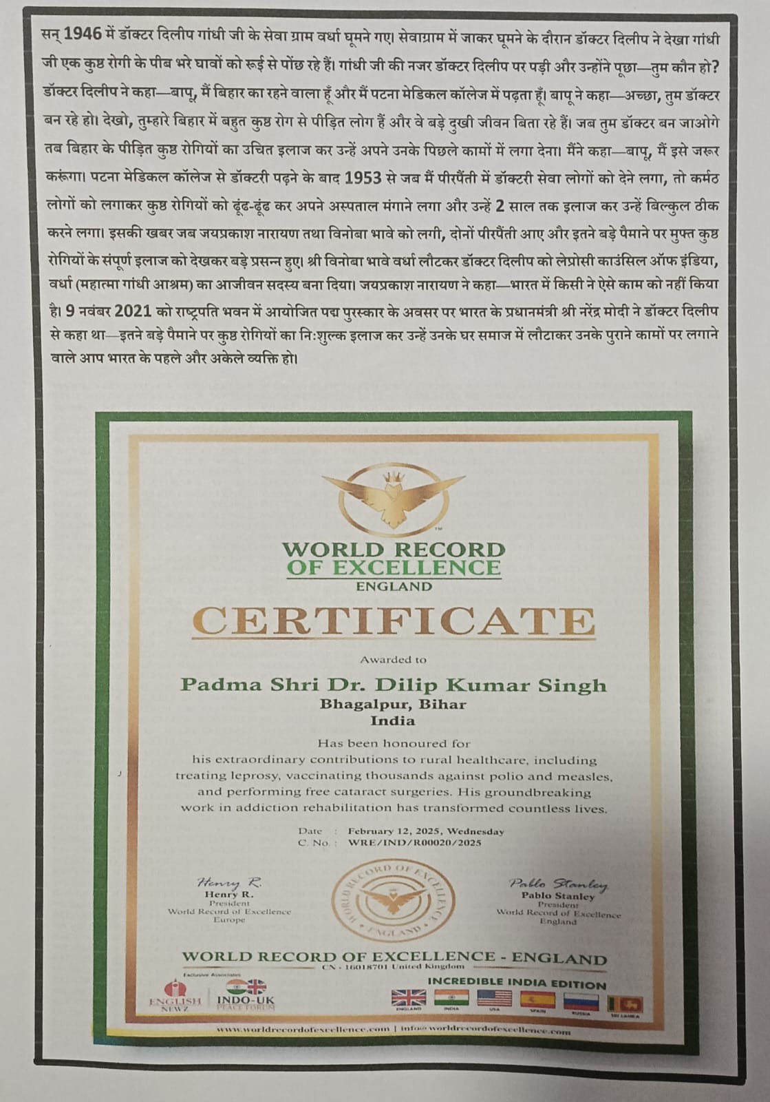 In 1946 Dr. Dilip Kumar singh went to Mahatma Gandhi’s Wardha Ashram, there in Sewagram Gandhi Ji was taking care of a Leprosy patient. He was Cleaning ‘Pus’ from Leper’s wound while Dr. Dilip was watching this act of Bapu. Bapu asked Dr. Dilip who are you? Dr. Dilip said “I’M a medical student from Bihar”, then Bapu reacted and said ‘ Oh! you are a budding Doctor. there are lot of lepers in Bihar leading a filthy life begging for some food in front of a Mosque, a Temple or on Railway platform- Do take care of them when you become a Doctor. You Locate them, treat them and rehabilitate them in their previous job ‘. With folded hands Dr. Singh replied, ” Bapu, I will Do it”.